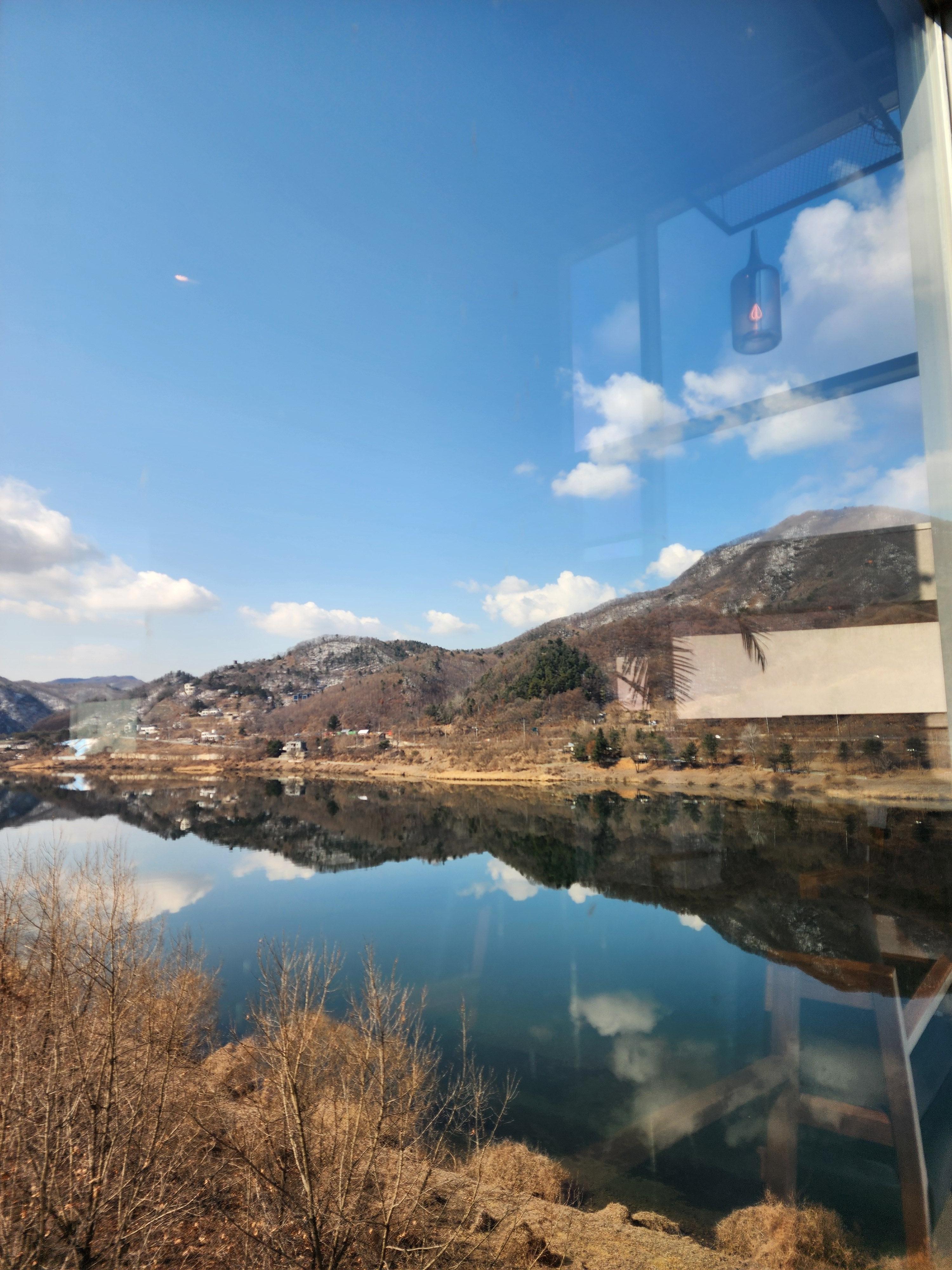 강에 데칼코마니로 비친 산과 구름.